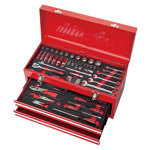 ●セット内容:6.35mm差込角ソケット(4・5・5.5・6・7・8・9・10・11・12・13mm)。 ●9.5mm差込角ソケット(10・11・12・13・14・15・17・19・21・22・24mm)。 ●9.5mm差込角ディープソケット(8・10・12・13・14・17・19mm)・9.5mm差込角ラチェットハンドル。 ●9.5mm差込角スライドヘッドハンドル・9.5mm差込角エクステンションバー(75・150mm)。 ●9.5mm差込角ユニバーサルジョイント・9.5mm差込角ビットアダプター・ソケットアダプター(凹9.5mm×凸6.35mm)。 ●コンビレンチ(8・10・12・13・14・17mm)・ドライバー(+1×75・+2×100・+3×150・-5×75・-6×100mm)・ビットドライバー・25mmビット(六角対辺6.35mm)。 ●六角棒レンチセット(1.5・2・2.5・3・4・5・5.5・6mm)・ニッパ150mm・ラジオペンチ150mm・コンビネーションプライヤー200mm・モンキレンチ200mm・ツールチェスト。 |