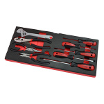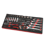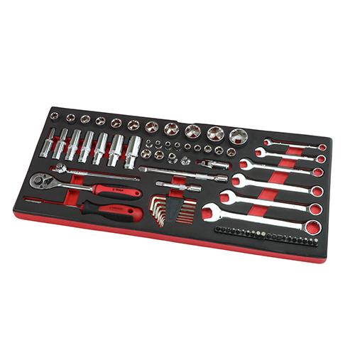 72山ギア採用のラチェットハンドルは狭い場所でも作業性抜群です。 工具形状にフィットするEVAトレー採用で、工具をしっかり保持します。 |