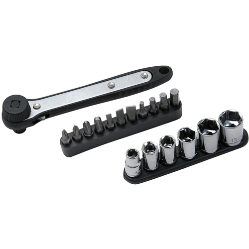ソケット、ビットを収納できるホルダー付です。 装着時全高42mm(ビット装着時)の薄型ヘッドで、狭いスペースでの作業に便利です。 ソケットもビットも使用可能な2WEYヘッド採用です。 クイックハンドルを使えば、指先でネジの早回し・仮締めが出来ます。 |