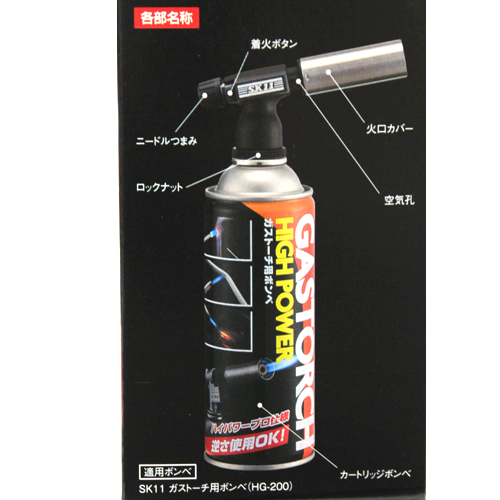 ●着火方式:圧電着火方式(プッシュタイプ)。 ●逆さ使用OK。 ●炎のタイプ:集中炎。 ●炎の温度:1700度(最高温度)・燃焼時間:約100分/缶(適用ボンベを使用)。 ●適用ボンベ:SK11ガストーチ用ボンベ(HG-200)・ねじ込み式ボンベ対応品。 ●バーナー本体外形寸法:長さ122mm×高さ75mm・ボンベ取り付け部径32mm。 ●バーナー本体重量:251g。 |
