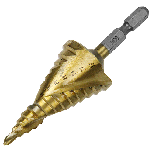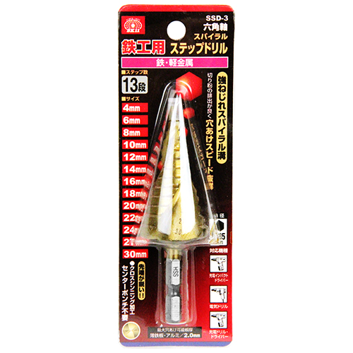 ●6.35mm六角軸。 ●段数:13段。 ●最大穴あけ可能板厚:薄鉄板・アルミ2.0mm以下。 ●対応機種:充電インパクトドライバー・充電ドリルドライバー・電気ドリル。 |