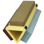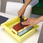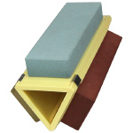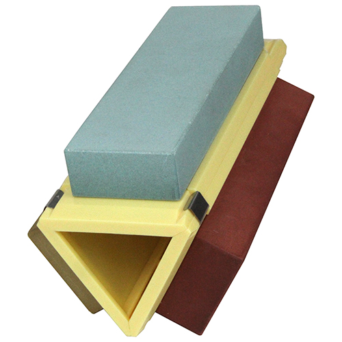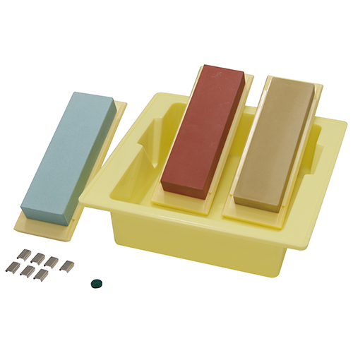 水をつけながらの作業を楽に行うため、専用の研ぎ桶がセットになっています。 砥石のセッティングは、クリップ式で簡単になっています。 荒砥石(緑)・中砥石(茶)・仕上砥石(黄土)3種類の砥石のセット品です。 |