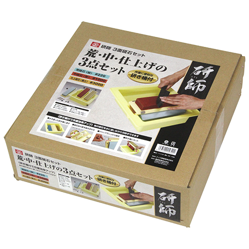 ●粒度:荒砥石(緑)220番・中砥石(茶)1000番・仕上砥石(黄土)3000番。 ●砥石サイズ(約):90×250mm(PC台含む)。 ●砥石:ベトナム製。 ●桶・金具:中国製。 |
